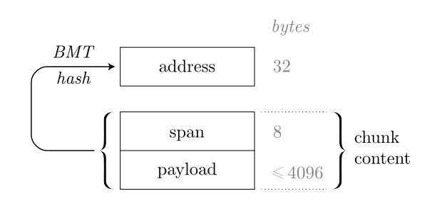 Content-addressed chunks are chunks whose address is based on the hash digest of their data. Using a hash as the chunk address makes it possible to verify the integrity of chunk data. Swarm uses the BMT hash function based on a binary Merkle tree over small segments of the chunk data. A content-addressed chunk has an at most 4KB payload, and its address is calculated as the hash of the span (chunk metadata) and the Binary Merkle Tree hash of the payload.