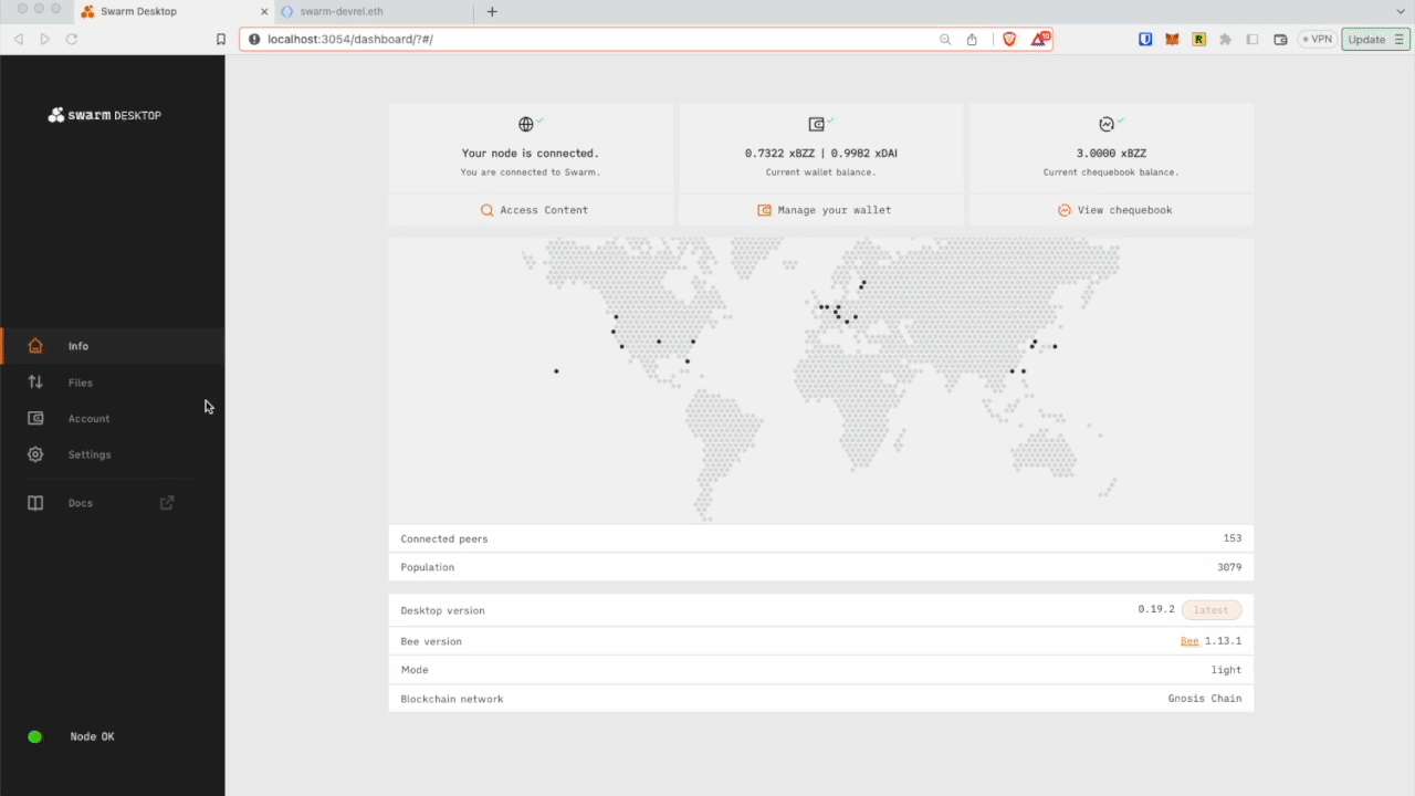 First, download and install the Swarm Desktop App. Next, add xDAI (transaction fees) to your Node Wallet address. If you possess xBZZ (storage fees), you can deposit it alongside the xDAI. Otherwise, you can exchange your xDAI for xBZZ using the Swarm Desktop app.